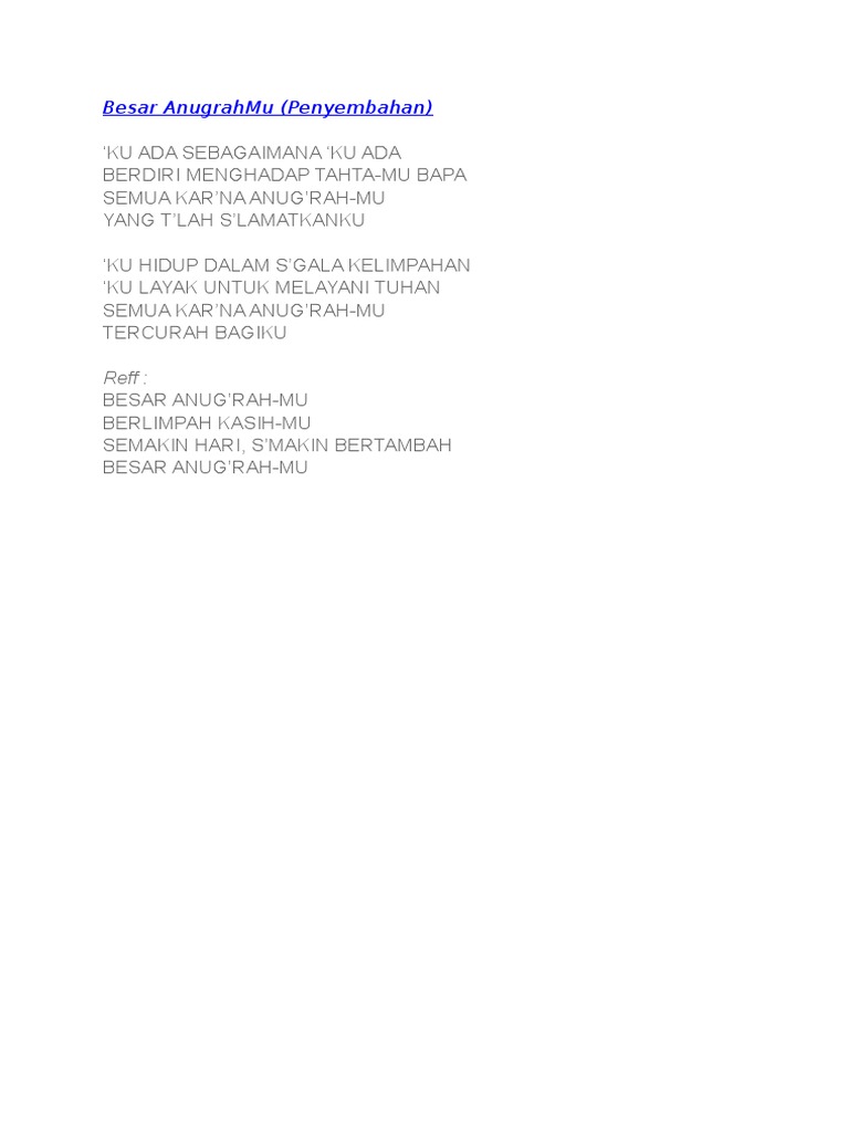 Besar anugrah-Mu berlimpah kasih-Mu semakin hari smakin bertambah besar. Ku ada sebagaimana ku ada Berdiri menghadap tahta-Mu Bapa Semua karna anugrah-Mu Yang tlah slamatkanku. Ku hidup dalam sgala kelimpahan.